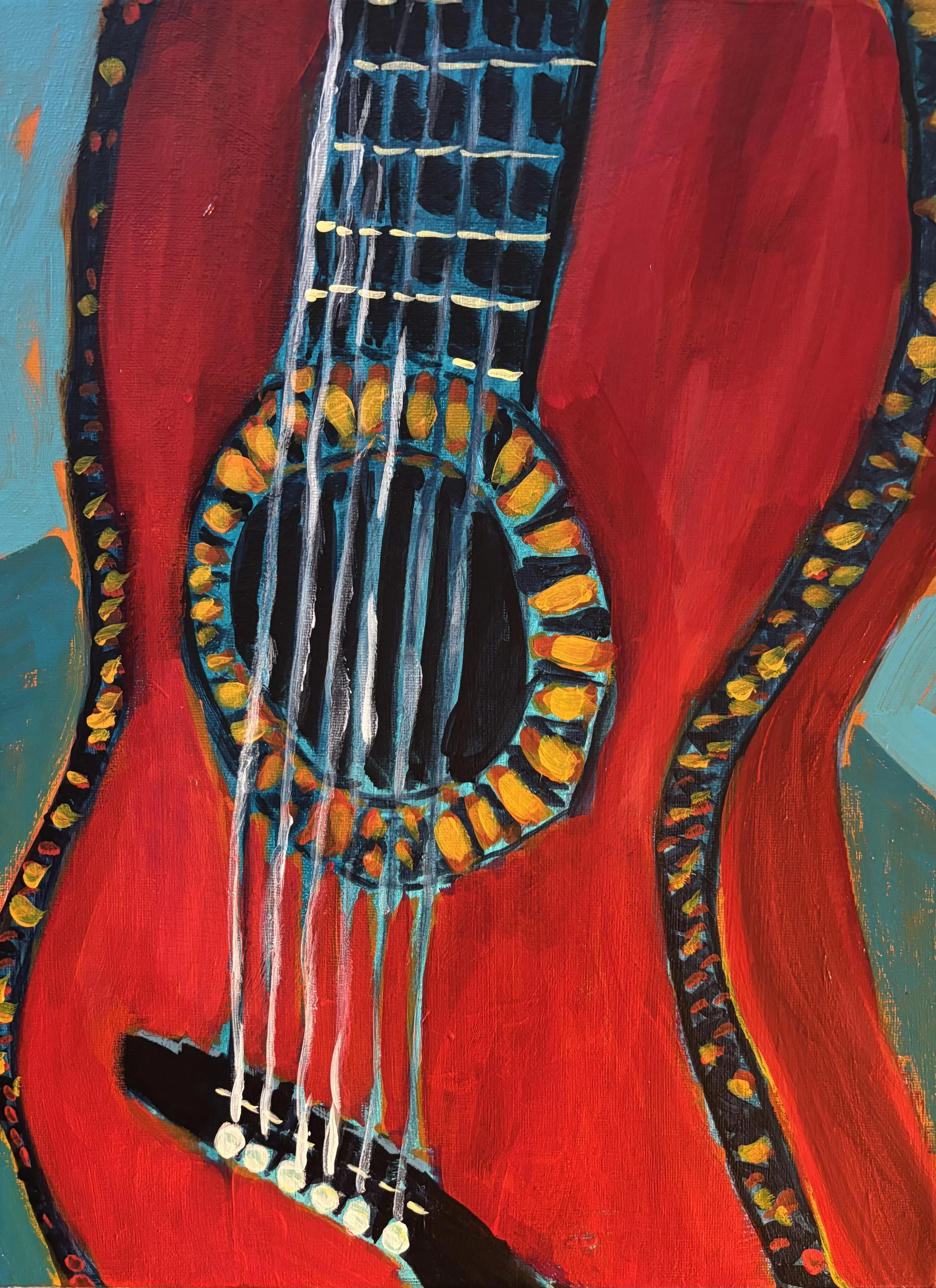Inspired by her parents’ 50th wedding anniversary, Amy wrote and recorded three songs. One song, “Dance” became a semifinalist in the Song of the Year contest. Find her songs on SoundCloud. Find the guitar painting in the Sweetgrass Studio Shop page.